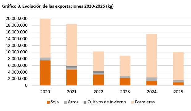 La baja en 2022 y 2023 se relaciona con la sequía y el descenso en la producción de soja y forrajeras, lo que redujo el volumen disponible para la exportación de semillas en esos años.