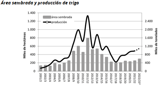 Las previsiones para la campaña triguera 2022/23 están influidas por una importante recuperación de la superficie sembrada de más de 44 mil hectáreas y por expectativas de buenos niveles de productividad que serían superiores al promedio histórico del cultivo. Como resultante, se proyecta un aumento en el volumen de la cosecha nacional que superaría el millón de toneladas, dice la Oficina de Programación y Política Agropecuaria en su Anuario 2022.