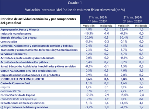 En el segundo trimestre (abril-junio), el Producto Interno Bruto (PIB) registró un incremento de 3,8% con relación al mismo período de 2023. En términos desestacionalizados, la actividad económica creció 2,0% respecto al primer trimestre de 2024, informó este jueves el Banco Central del Uruguay.