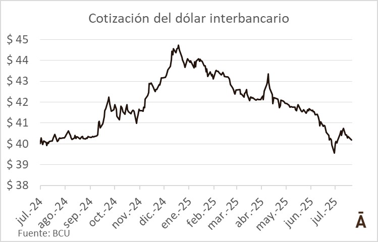 En la mediana de las respuestas, ahora proyectan un dólar a $ 41,60 para fines de diciembre versus los $ 42,40 que habían proyectado en junio. El rango pautó una cotización mínima para ese horizonte temporal de $ 39,75 y un máximo de $ 43. Este lunes el dólar en Uruguay operó a la baja. El cierre interbancario fue a $ 40,13, un descenso de 0,6% versus el viernes pasado. En lo que va del año el dólar en Uruguay se debilita 8,8% versus el peso uruguayo.
