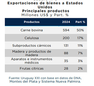Uruguay exportó en 2024 a EEUU bienes por unos US$ 1.275 millones, que pagaron por concepto de aranceles US$ 105 millones, donde US$ 92 millones los pagó la carne bovina ya que el resto de los productos relevantes enfrentaban aranceles bajos. En la reunión fue confirmado que la madera queda excluida del arancel adicional, tal como figura en el Anexo de la Orden Ejecutiva de Trump, y se quedó en profundizar sobre el alcance para otros productos relevantes de la oferta exportable de Uruguay, según el MEF. El año pasado Uruguay exportó madera y productos de madera a EEUU por US$ 88 millones, con una participación del 7% en el total, según Uruguay XXI.