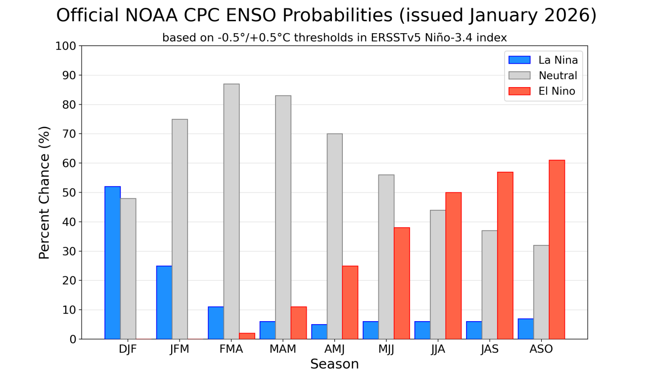 Aunque el sistema ENSO se mantiene formalmente en fase La Niña, los últimos diagnósticos de la NOAA confirman que su influencia comienza a debilitarse. Las temperaturas del Pacífico ecuatorial siguen levemente por debajo del promedio, pero el calentamiento del océano en niveles subsuperficiales anticipa un cambio de fase en los próximos meses.