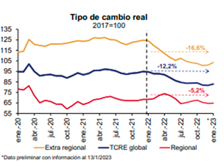 En su Informe de Política Monetaria (IPOM) del cuarto trimestre (octubre-diciembre), el Banco Central del Uruguay (BCU) hizo un detallado análisis de la evolución del tipo de cambio en Uruguay, una variable que ha estado bajo cuestionamiento por parte de diferentes actores del sector agropecuario y otros agentes económicos. Algunos han cargado las baterías contra una política monetaria excesivamente contractiva (suba de la tasa de interés en pesos) para contener las presiones inflacionarias por parte del BCU. En una perspectiva histórica, el dólar tuvo en 2022 su mayor caída (-10,35%) punta a punta desde 2009 (-19,4%).