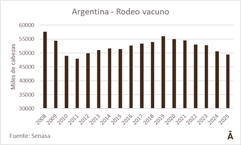 Argentina nunca logró recuperar aquel nivel de existencias bovinas. Lo más cerca que estuvo fue en 2019, con 55,0 millones de animales. Desde 2022, cuando se contaron 52,99 millones de cabezas, la caída se agudizó año tras año, en paralelo a una extensa sequía que abarcó casi tres ciclos.