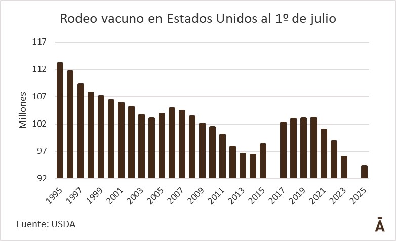 El informe semestral de inventarios de ganado de Estados Unidos mostró alrededor de 94,2 millones de bovinos y terneros, 1,3% menos que en 2023 (no hubo informe en 2024) y el menor registro a mitad de año desde que existen datos.