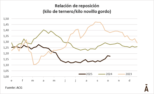 El impacto del buen arranque de la primavera ya se está observando en la relación de reposición. De acuerdo con los datos que maneja ACG, la relación ternero/novillo gordo pasó de 1,13 en agosto a 1,18 en la primera quincena de octubre.