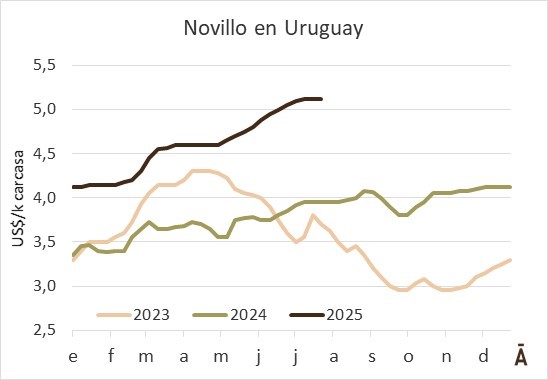 “La mayoría de los negocios de novillos se siguen haciendo entre US$ 5,00 a US$ 5,10 el kilo carcasa, con casos puntuales a US$ 5,15”, comentó en la tarde de ayer un intermediario. En el caso de las vacas, oscilan entre un piso de US$ 4,70 a un techo de US$ 4,90 si las carcasas son de más de 240 kilos. Las vaquillonas se pagan a US$ 4,95-5,00, categoría que sigue encontrando buena demanda desde el abasto.