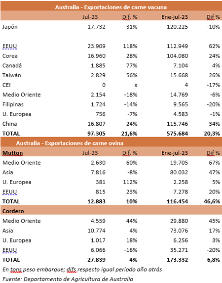 Estados Unidos se consolida como el principal destino de las exportaciones australianas con 23.909 toneladas en julio, superando con holgura a Japón, Corea del Sur y China que llevaron en el entorno de 17 mil toneladas. En el año a julio las exportaciones a EEUU crecieron 62% anual.