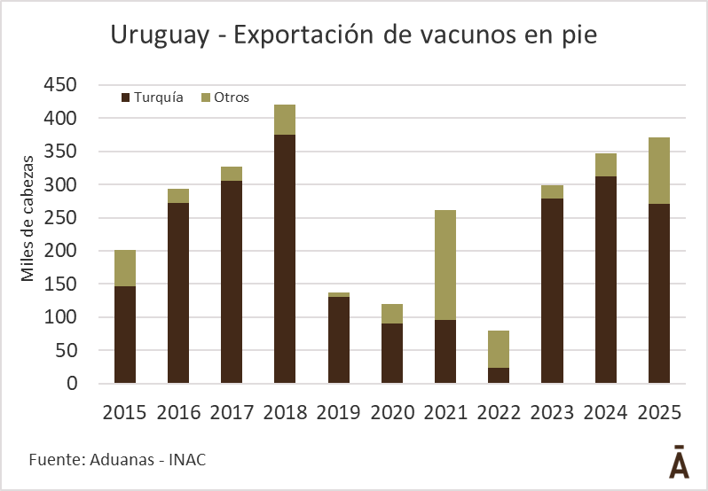 Turquía continuó siendo el principal destino, pero con una proporción en descenso. En 2025 se dirigieron a este mercado 271.042 vacunos, 73% del total.