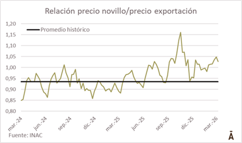Con una relación histórica entre el precio del novillo y el de la tonelada exportada, los novillos deberían cotizar a US$ 5,15-5,20 el kilo carcasa. Es probable que el objetivo de la industria sea llevarlo a esos niveles.