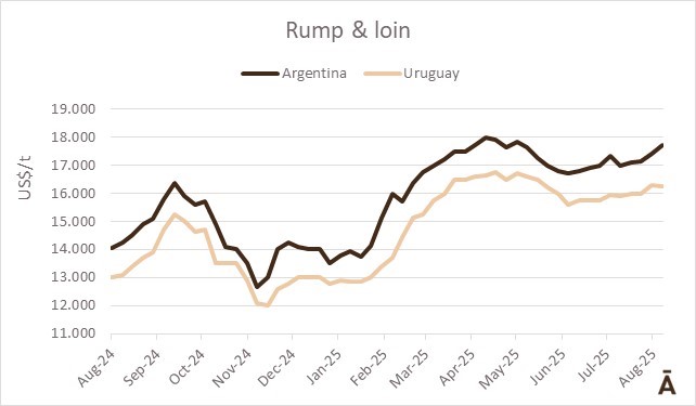 Los precios para los negocios cerrados durante la última semana para los cortes del rump & loin Hilton volvieron a tonificarse y se acercan a los máximos alcanzados a fines de abril. Fuentes del mercado de importación manejaron compras desde Argentina en un rango de US$/t 17.600-17.850 FOB para el Hilton, mientras que esta semana eran varias las plantas argentinas que estaban pretendiendo US$/t 18.000 para nuevas cargas.