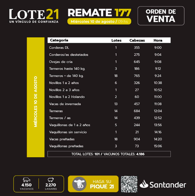 Este miércoles 10 Lote 21 rematará vacunos y lanares en una nueva jornada de venta, la Nº 177, desde el Club de Golf del Uruguay, a partir de la hora 9. En esta oportunidad se pondrán a consideración 4.150 vacunos y 2.270 ovinos.