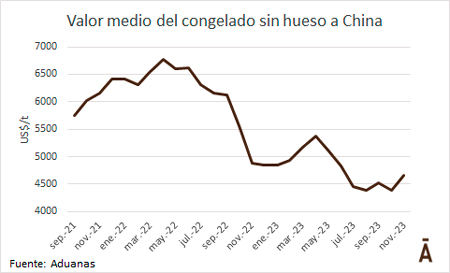 Todos los principales destinos aumentaron sus compras respecto a octubre, con el destaque de China, que llevó 25.462 toneladas, un aumento mensual de 6 mil tons y el mayor volumen mensual en 20 meses, desde marzo de 2022. El valor medio del congelado sin hueso a China fue de US$/t 4.657, el más alto desde junio y 6% por encima de octubre.