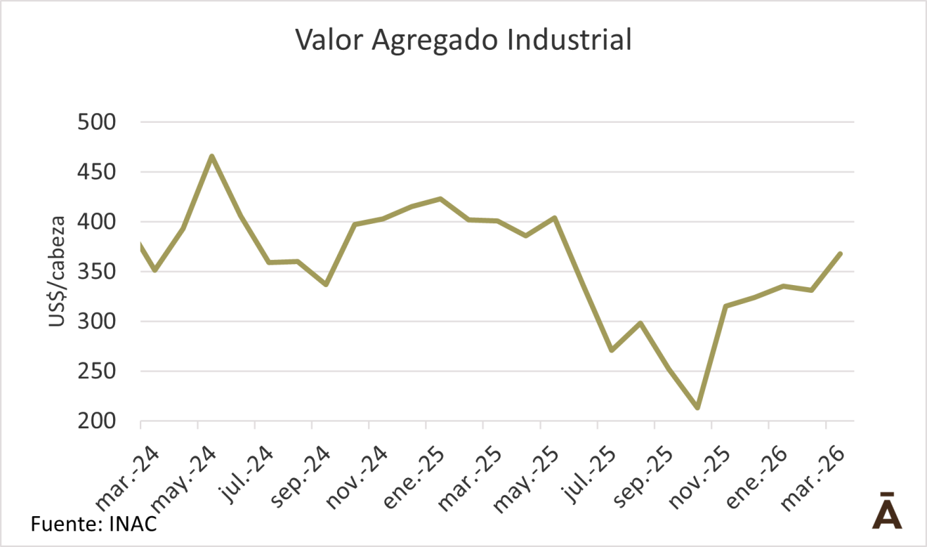 Por su parte, el valor agregado industrial (VAI), avanzó 11% el pasado mes (+US$ 37) y se ubicó se ubicó en US$ 368 por animal faenado. Así, la participación del VAI pasó del 17% en febrero a 19% en marzo. De todas formas, está por debajo del promedio de los últimos tres años, que ha sido de 75% para valor de la hacienda y 25% para el VAI.