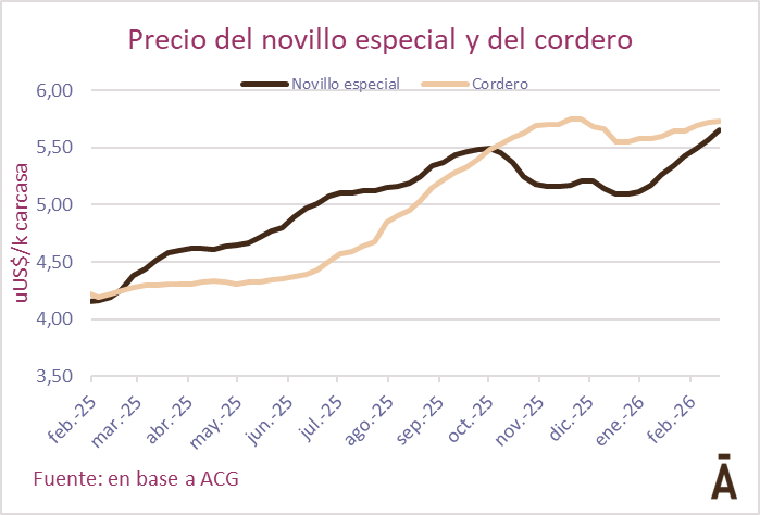 En la semana cerrada al 21 de febrero, los novillos hicieron un promedio de US$ 5,59 por kg carcasa (+9 cents), las vacas gordas de US$ 5,33 (+12 cents), y las vaquillonas de US$ 5,42 (+12 cents). Los novillos especiales de exportación quedaron con una referencia de US$ 5,65 por kg a la carne (+8 cents).
