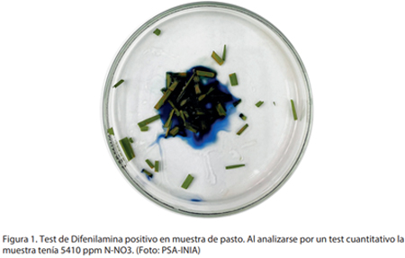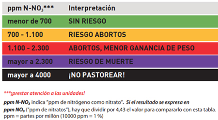 Determinación del contenido de nitratos en la savia de las plantas. Se sugieren valores superiores a 1.100 – 1.500 ppm de nitratos en savia como potencialmente tóxicos.