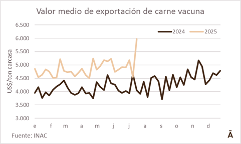 Es el dato de solamente una semana y en general el Instituto Nacional de Carnes (INAC) corrige (a la baja) el número la semana siguiente, pero el valor medio de la tonelada exportada en los siete días al 19 de julio fue de US$ 5.969 en su equivalente carcasa, un récord para el país, superando con relativa holgura el anterior máximo, que se había dado en 2022, de US$ 5.698 por tonelada carcasa.