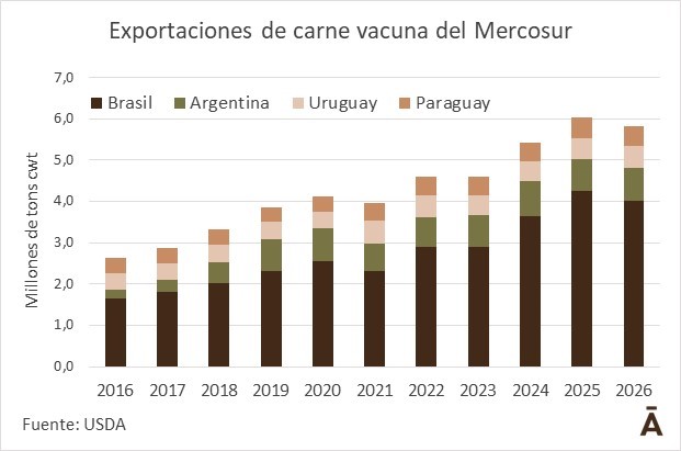 Las exportaciones globales de carne vacuna en 2026 caerían 1% hasta 13,5 millones de toneladas, debido a menores embarques desde Australia, Brasil y Estados Unidos, que compensarían incrementos desde Argentina, India, México y Nueva Zelanda, según proyectó el Departamento de Agricultura de Estados Unidos (USDA) en su primera estimación para el comercio mundial de carne en 2026.