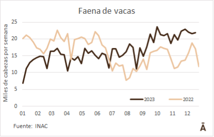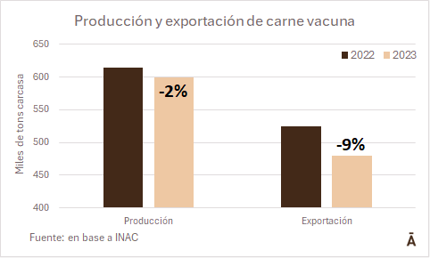 La arremetida final de la faena de vacunos en Uruguay durante 2023 redujo sensiblemente la caída respecto al año anterior, a lo que se suma un aumento en el peso medio de las carcasas para determinar una contracción de la producción de carne de solo 2,5% en el año.