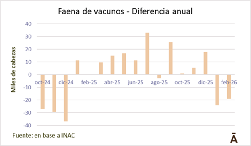 La faena de vacunos creció de forma moderada la semana pasada. INAC informó que en la semana al 28 de febrero ingresaron a planta 41.963 vacunos, algo más de 1.000 por encima de la anterior, pero 1.700 por debajo en la comparación anual.