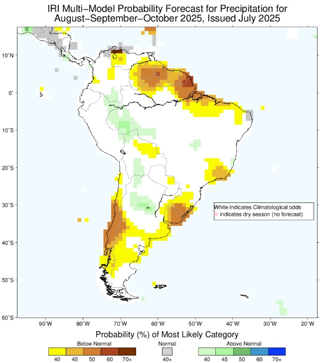 Según el último informe del Instituto Internacional para la Investigación del Clima y la Sociedad (IRI) de la Universidad de Columbia, se prevé una probabilidad elevada de condiciones climáticas neutrales en la región de América del Sur durante el período agosto-octubre.