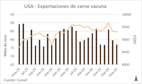 Las exportaciones de carne y subproductos vacunos de Estados Unidos totalizaron 97.266 toneladas en mayo, una caída del 12% interanual y el volumen más bajo en casi cinco años. En términos de valor, se registraron US$ 798,7 millones, un descenso de 11,5% y el nivel más bajo en 18 meses. En el caso de la carne, el volumen embarcado fue de 76.967 toneladas por US$ 716 millones. Entre enero y mayo, las exportaciones acumularon 508.293 toneladas, un 5% menos que en igual período de 2024, con un valor total de US$ 4.150 millones (-3%).