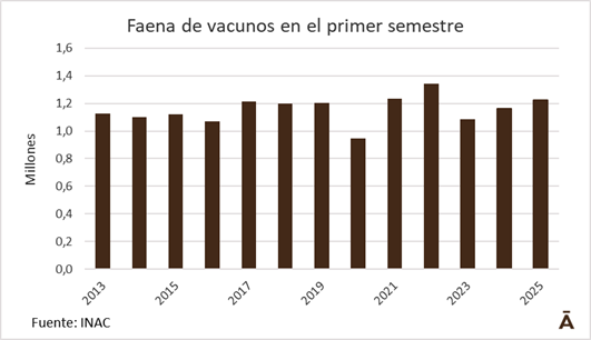 La faena de vacunos en junio creció por sexto mes consecutivo en la comparación anual, acumulando 1,22 millones de cabezas en el primer semestre del año, unas 64 mil más (+5,5%) que en el mismo período de 2024. Fue la tercera máxima faena de la historia para el primer semestre del año, solo detrás del récord de 2022 y de 2021.