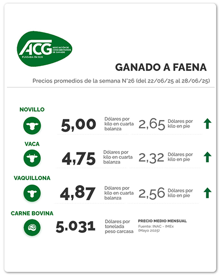 Con una faena “estable”, el mercado de hacienda cerró otra semana “firme”, según el comentario de la ACG. Tras su reunión de precios de este lunes, los intermediarios llevaron la referencia del novillo gordo a un promedio de US$ 5,00 por kg a la carne (+5 cents) para la semana cerrada al 28 de junio, a US$ 4,75 para las vacas gordas (+3 cents) y a US$ 4,87 (+1 cent) para el caso de las vaquillonas. Los mejores novillos de exportación treparon a US$ 5,07 por kg a la carne (+6 cents).