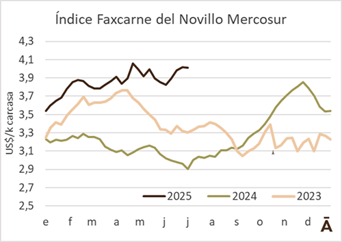 El valor medio del novillo a faena en los países del Mercosur sufrió una mínima corrección de 1 cent en la semana. El Índice Faxcarne del Novillo Mercosur se ubicó en US$ 4,01 el kilo carcasa.