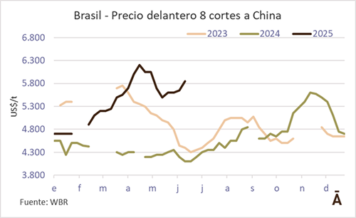 Con varias plantas brasileñas relativamente “cómodas” en sus ventas por negocios concertados en semanas previas para cargas hasta julio, los frigoríficos se afirmaban en sus intenciones de lograr cierres a precios superiores esta semana. Fuentes de la intermediación manejaron referencias a World Beef Report (WBR) de US$/t 5.900 CFR para el delantero en 8 cortes, mientras que desde la industria un exportador acotó que “ya se habla de negocios arriba de US$/t 6.000” y de un delantero robado sobre un eje de US$/t 4.950. Otro industrial acotó que como el ganado en Brasil estaba subiendo, optaron por “retirar” sus ofertas esta semana y esperar un poco antes de cerrar nuevas cargas.