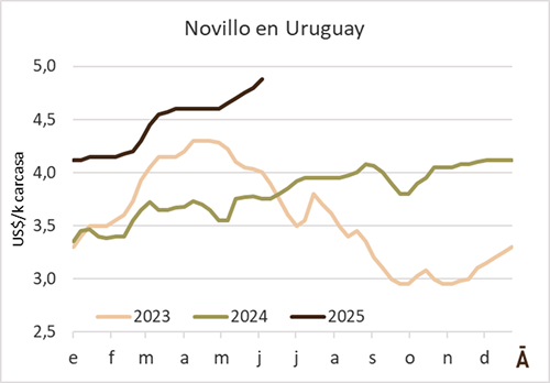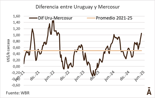 Las dinámicas internas y de los mercados externos provoca fluctuaciones naturales en la formación de los precios del ganado para faena en los países del Mercosur. Al promediar la semana, el precio del novillo especial de exportación en Uruguay rondaba los US$ 4,88 por kg carcasa. Eso llevó a que la brecha de precios con el promedio del novillo Mercosur (US$ 3,83 por kg) llegará a US$ 1,05 por kg. Para encontrar una diferencial de valores entre la materia prima local y el promedio de la región hay que remontarse a agosto de 2022 (US$ 1,08). En ese entonces, Uruguay tenía un novillo especial en US$ 5,00 por kg.