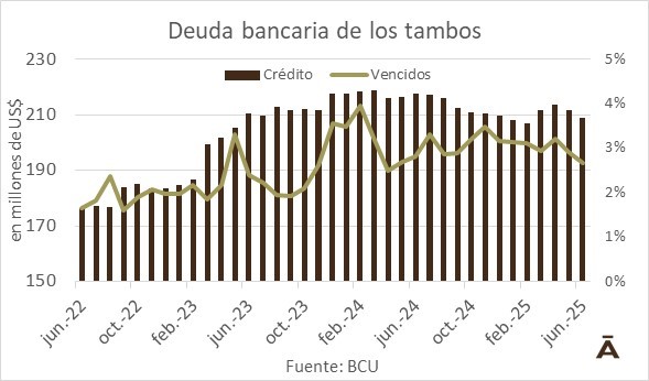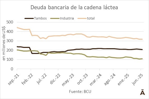 Tomando en cuenta la cadena (tambos + industrias), los créditos con los bancos totalizaban unos US$ 318 millones al cierre del primer semestre de 2025, un mínimo en al menos nueve años, según se desprende de los datos del BCU.