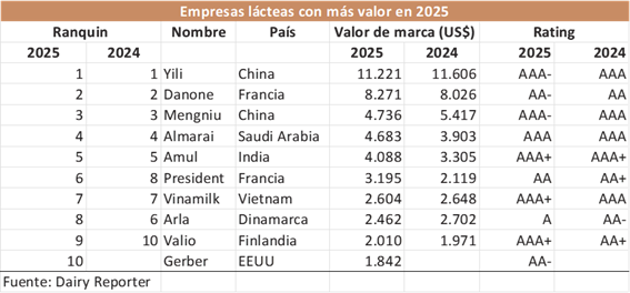 En el caso del sector lácteo, quien sigue a Yili es la francesa Danone con un valor que supera los US$ 8,2 mil millones en 2025 y con senda de crecimiento respecto al año anterior. No sucede lo mismo con la tercera más grande, la china Mengniu que, al igual que su compatriota Yili, vio caer el valor de su marca en este caso unos US$ 700 millones a US$ 4,7 mil millones.