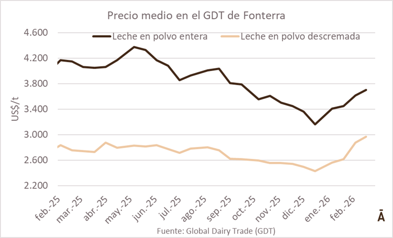 En tanto, la leche en polvo descremada subió 3% y quedó a US$/t 2.973.