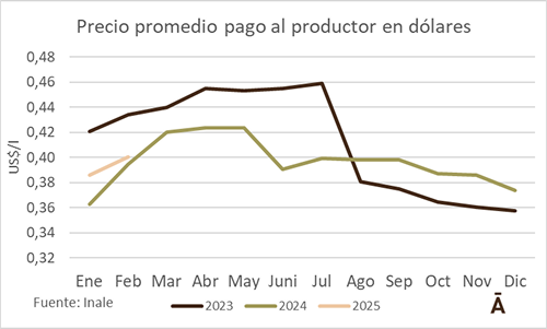 El poder de compra de la leche en pesos en febrero cerró en 101 y subió 10,7% respecto al mismo mes de 2024 y 4% versus enero, con un aumento mayor del índice de precio de leche (14,7%) acompañado por uno menor del índice de costos (3,7%), según el Inale. El índice llegó así a su mayor nivel desde mayo del año pasado y está levemente por encima del año base marzo 2024=100.