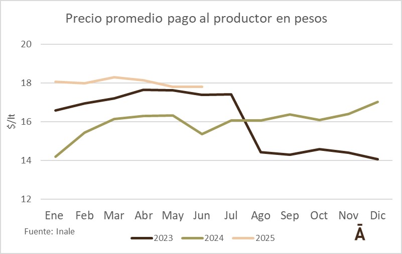 En tanto, en dólares corrientes, el precio por litro que recibieron los tamberos fue de US$ 0,44 por litro un máximo en el año, aunque aún no logra superarse el récord de US$ 0,45-0,46 que se llegó en el invierno de 2023. En el último año móvil a junio, el precio de la leche en la moneda estadounidense subió 11,4%, en línea con la depreciación del tipo de cambio (-10,3%).