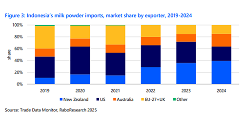 El mercado indonesio de ingredientes lácteos importados es altamente competitivo, con una fuerte presencia en todas las principales regiones exportadoras de lácteos. La participación de mercado puede fluctuar significativamente en función de la oferta regional de productos, la competitividad de precios y el apetito importador de China. Nueva Zelanda ha aumentado su participación en el mercado indonesio de leche desnatada en polvo en los últimos años, mientras que el interés de China por la leche entera en polvo importada ha disminuido. Simultáneamente, existen límites visibles para el crecimiento de la producción en las regiones exportadoras de lácteos y ciclos de inversión centrados en productos como el queso. Será importante estar atentos a los cambios en la oferta de productos y la orientación del mercado de las principales regiones exportadoras de lácteos. Fuente: OCLA del Informe de Rabobank por Michael Harvey – Analista Senior