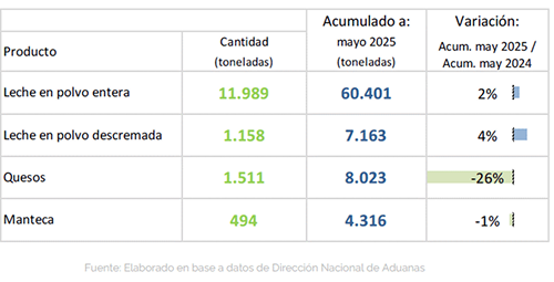 Un dato interesante que muestran los datos de comecio exterior es el descenso en el volumen embarcado de quesos en los primeros cinco meses de 2025. Con 8.023 toneladas embarcadas en enero-mayo, ese volumen exportado cayó 26% versus igual período del año pasado. En el caso de la manteca, la caída es marginal (-1%) con 4.316 tons embarcadas. En la otra vereda, las ventas de LPE suman 60.401 (+2%), y las de LPD unas 7.163 (+4%).