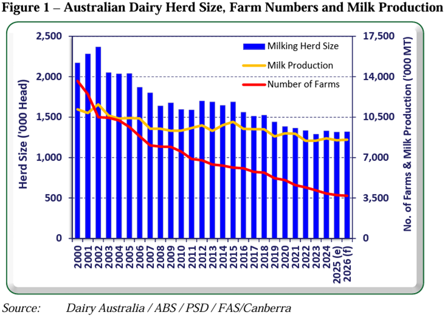 El USDA proyecta una leve recuperación en la producción australiana de leche para 2026, pero una caída en las exportaciones de leche en polvo entera y una estabilidad en la descremada, lejos de los máximos históricos.
