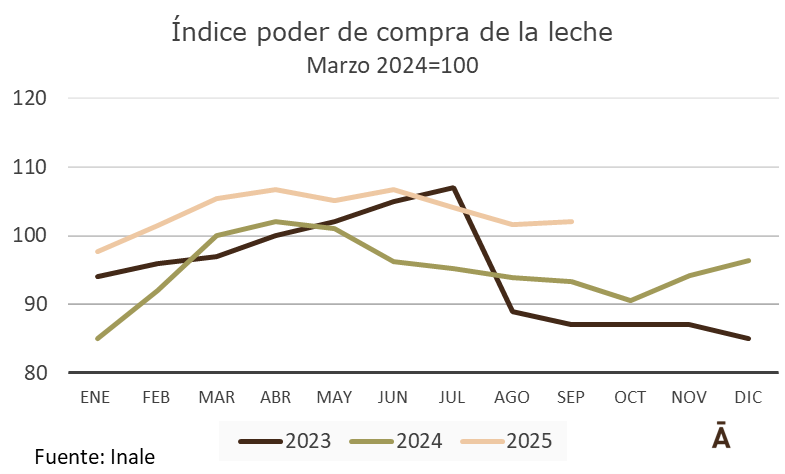 El índice de poder de compra de la leche en pesos (marzo 2024=100) cerró setiembre con un valor de 102 y subió 0,4% versus agosto, según el Inale.