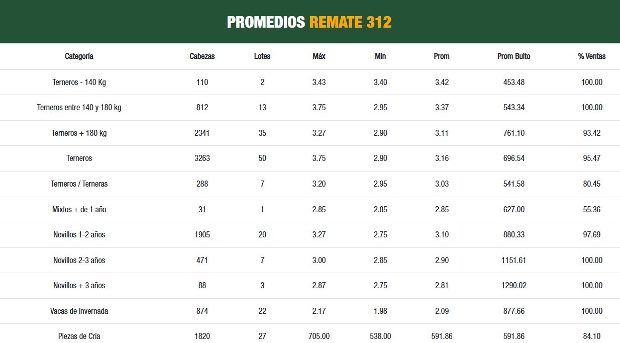 Los novillos de 1 a 2 años promediaron US$/kg 3,10, los de 2 a 3 años US$/kg 2,90, y las vacas de invernada US$/kg 2,09. Las piezas de cría alcanzaron US$ 591,86 de promedio por bulto.