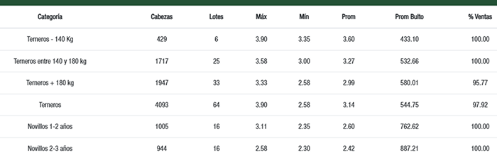 Los terneros de menos de 140 kg hicieron un promedio de US$ 3,60 por kg (US$ 433 al bulto), los de 140-180 kg US$ 3,27 (US$ 533 al bulto), y los +180 kg US$ 2,99 (US$ 580 al bulto). Por otro lado, los novillos de 1 a 2 años hicieron US$ 2,60 por kg, y los de 2 a 3 años US$ 2,42.