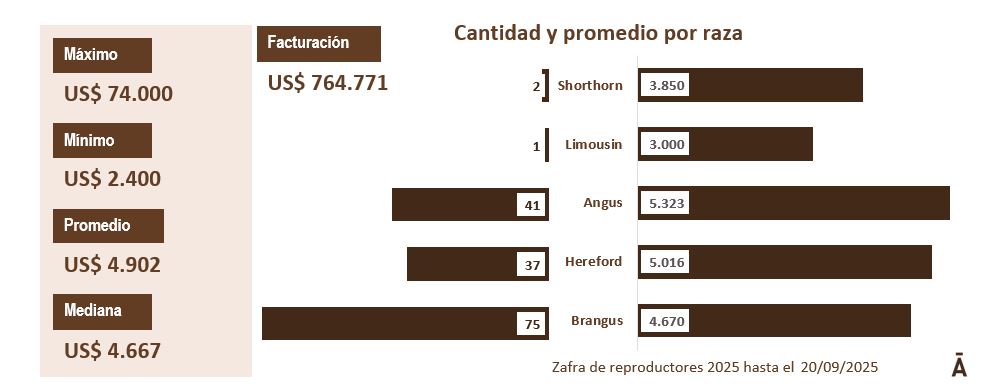 De acuerdo al relevamiento que realiza Informe Tardáguila para la Puesta a Punto de la Zafra, los primeros 156 toros comercializados en remates de particulares, Expo Prado y Kiyú hasta este sábado 20 de setiembre, hicieron una mediana de US$ 4.667 versus los US$ 3.618 logrados con los primeros 135 toros en igual fecha de la pasada zafra (+29%).